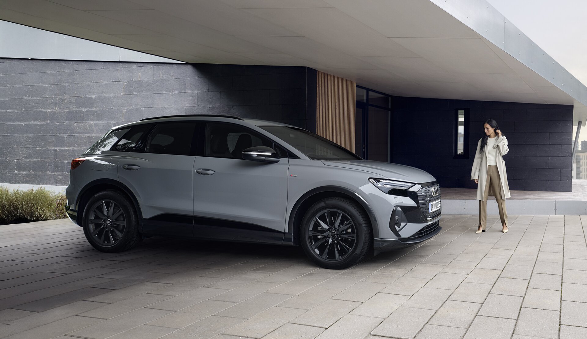 Q4 e-tron er en praktisk SUV med imponerende plass og premiumfølelse. Den har et moderne, skarpt design med en markant front, aerodynamiske linjer. quattro firehjulstrekk er standard, og med forvarming av batteriet lades bilen raskt selv under kalde forhold.